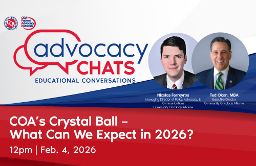 Join CPAN’s annual Advocacy Chat Kick Off on Wednesday, February 4, 2026, at 12 p.m. ET to hear from COA's Executive Director, Ted Okon, and Managing Director, Nick Ferreyros, on what we anticipate the 2026 policy landscape in Washington will look like and what progress has been made on COA’s top policy and advocacy issues. From PBMs, to hospital consolidation and multiple threats to the patient and provided relationship, Advocacy Chat host and COA’s Director of Patient Advocacy and Education Rose Gerber, MS, will ask the questions that COA’s audience cares about, including protecting the patient and physician relationship and removing obstacles to ensure that patients continue to have access to high-quality cancer care.